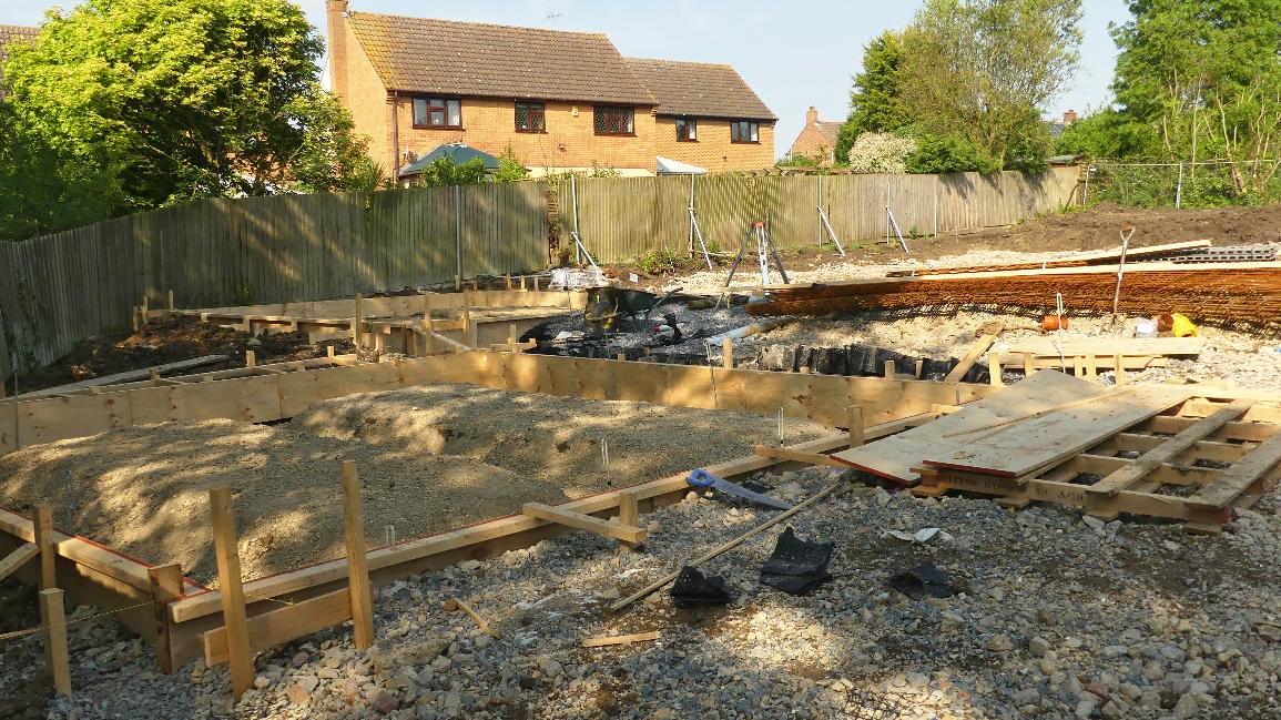 The garages sit on a simple reinforced concrete raft foundation. The clay on which the driveway sits is expected to swell and shrink with the seasons - the garage slab should move with the driveway. Here the formwork has been placed around the slab.