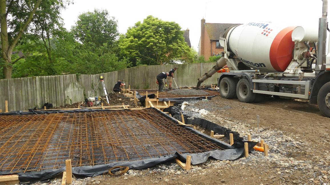 Once the reinforcement has been placed and tied the concrete can be poured - the slabs required approx 10 cubic meters of concrete each.