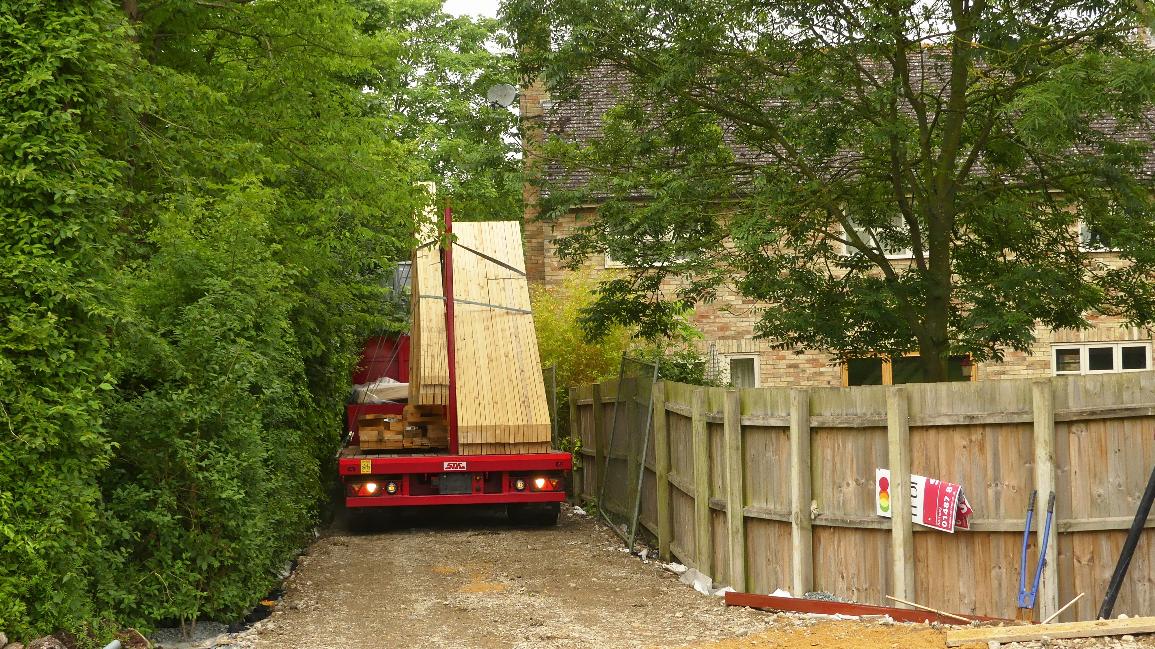 The garage trusses and timber framed gable wall arrive on site.